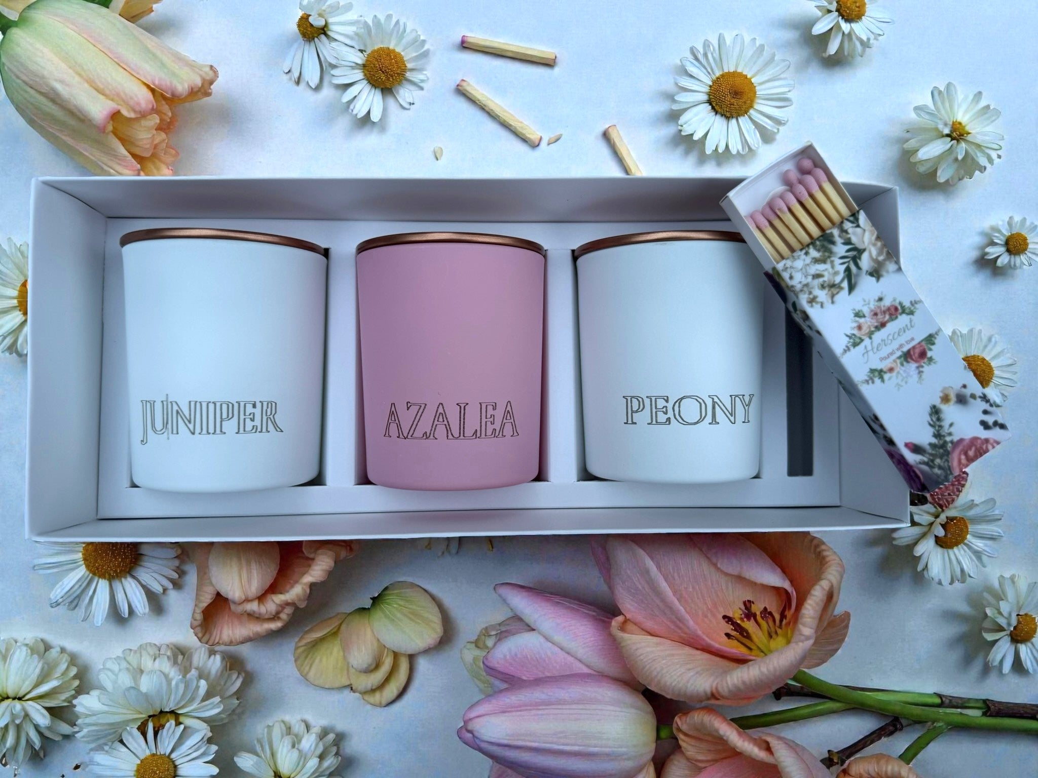 Discover the candles of the Herscent collection in a set containing three of its iconic signatures: Azalea - Herscent Collection, Peony - Floral Collection and Juniper - Botanical Collection.